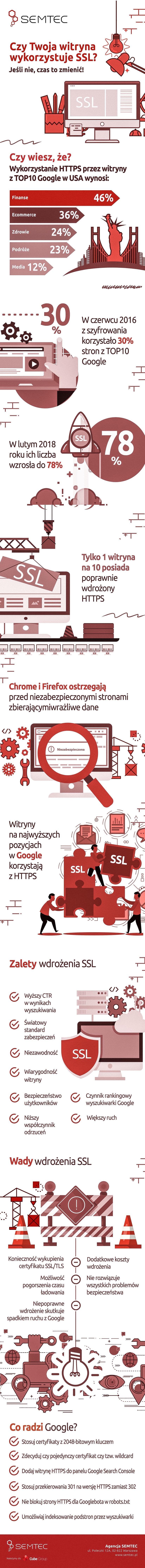 Jaki jest zakres korzyści, a jakie są minusy stosowania certyfikatu SSL? W jakich branżach jest najczęściej wykorzystywany i co radzi Google, aby wdrożenie bezpiecznego połączenia HTTPS nie spowodowało obniżenia widoczności witryny w rezultatach wyszukiwarki? Informacje te przedstawia infografika przygotowana przez agencję SEO SEMTEC.