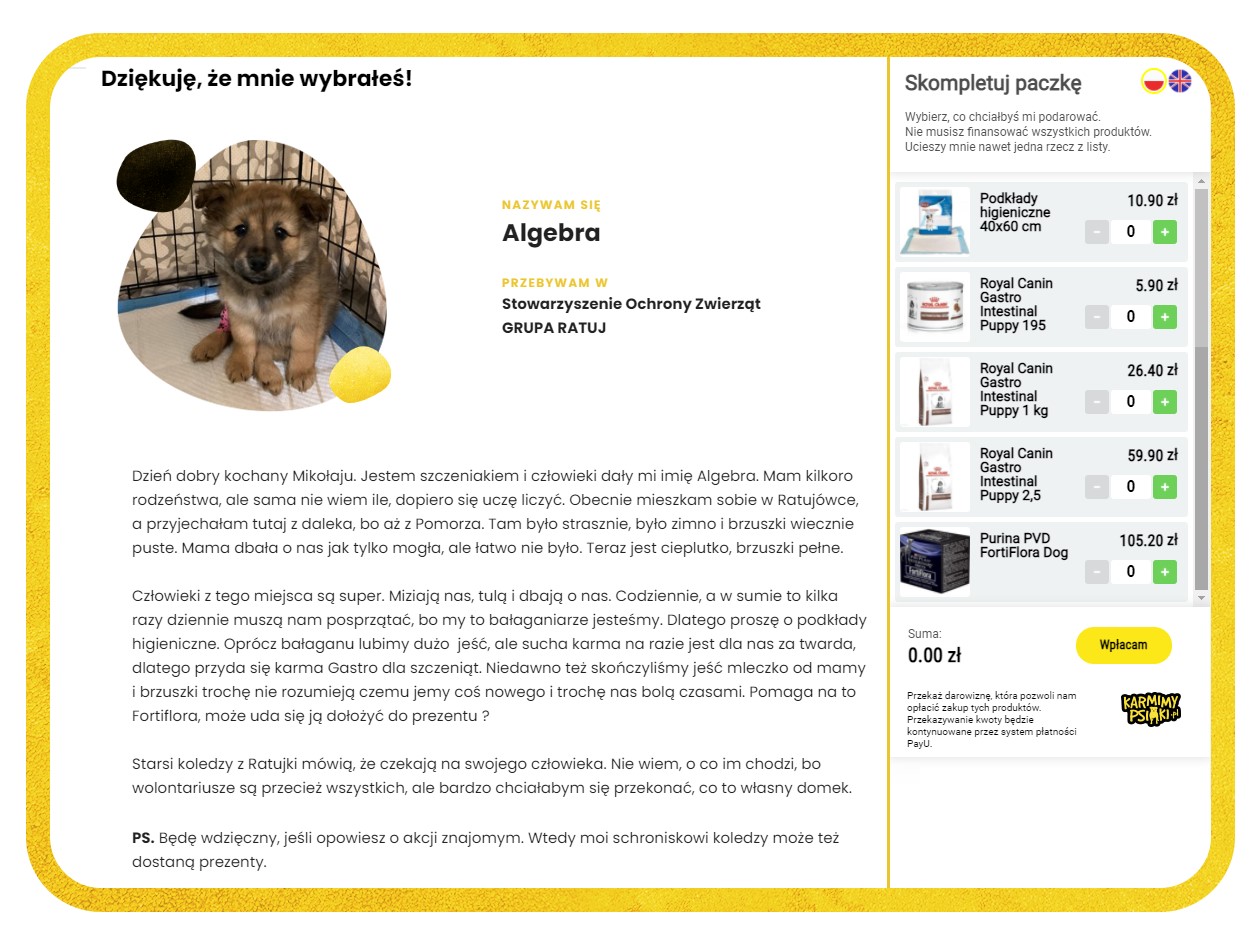 W schroniskach przebywa wiele starszych, schorowanych zwierząt, a także szczenięta i kocięta. Potrzebują one specjalistycznej karmy, suplementów i dodatkowego wyposażenia, które zapewni im komfort. Schronisk często nie stać na taki wydatek. W odpowiedzi na ten problem stworzyliśmy akcję #CharytatywnaChoinka. Jesteśmy bardzo szczęśliwi, że co roku spotyka się ona z tak ciepłym przyjęciem i możemy pomagać na tak dużą skalę – tłumaczy Marta Adaśko z Karmimy Psiaki.