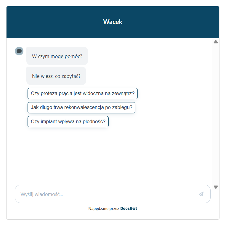 Chatbot Wacek pozwala mężczyznom w różnym wieku dowiedzieć się więcej na temat swojego stanu zdrowia, problemów z erekcją czy dostępnych zabiegów wykonywanych w obrębie miejsc intymnych. Celem akcji jest pokazanie, że warto rozmawiać nawet na tematy trudne i często pomijane społecznie, a do takich właśnie należy m.in. męskie zdrowie intymne. Jak czytamy na stronie chatbota: „Bez wstydu, bez zbędnych teorii – prosto, z humorem i z troską o to, co naprawdę ważne: Twoje zdrowie”.