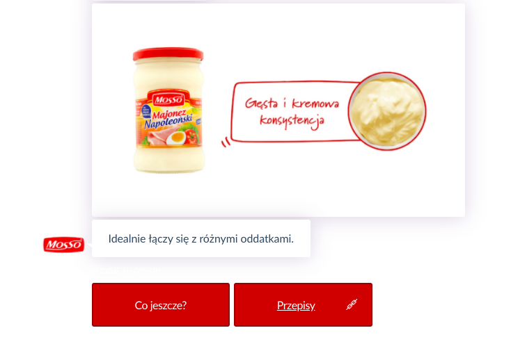 Po prezentacji przepisu, przyszedł czas na badanie zadowolenia ze współpracy z chatbotem. Dbając, by nasze komunikaty były nienachalne i stanowiły kolejny, naturalny etap relacji z odbiorcą, użytkownikom deklarującym satysfakcję z wyświetlanych treści prezentowaliśmy graficznie walory majonezów Mosso.