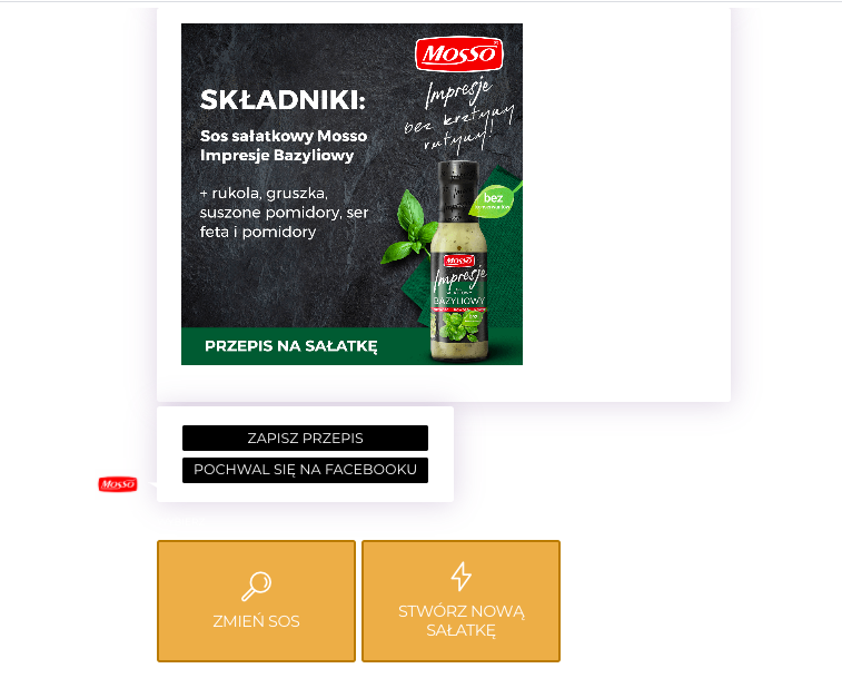 Nadchodzi czas na kulminacyjny moment ścieżki chatbota. Wraz z dynamicznym wygenerowaniem przepisu na grafice, chatbot informuje, który z dostępnych na rynku Sosów sałatkowych Mosso Impresje będzie najlepszym dodatkiem do potrawy. Gotową recepturę można zachować na później, a także udostępnić na Facebooku.