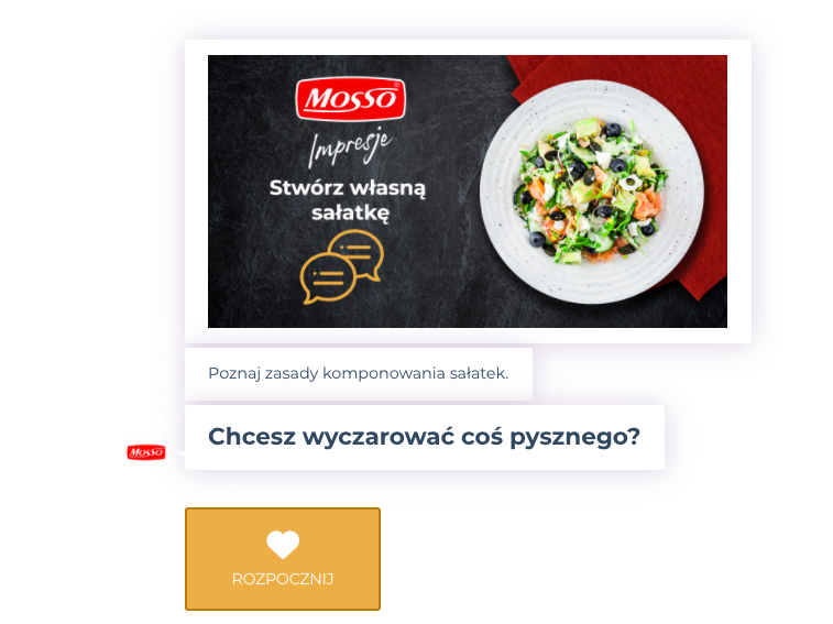 W momencie, gdy użytkownik zadeklarował swój składnik, chatbot kontekstowo proponował kolejne treści związane z przepisem na inne potrawy, bazujące na wskazanym dodatku do sałatki. Każdy z przepisów odnosił się bezpośrednio do treści umieszczonych w serwisie blogowym, co pozwalało utrzymać atencję odbiorcy. Wszystkie zawierały w swoim składzie jeden z tradycyjnych produktów marki Mosso.