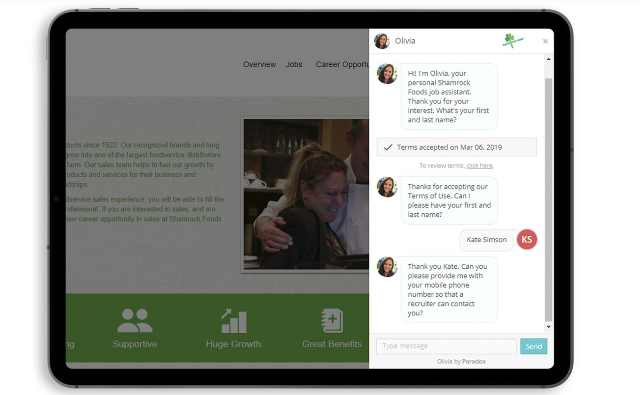 Czy znasz Shamrock Foods? To amerykańskie przedsiębiorstwo działające w branży gastronomicznej, które zdecydowało się na zastosowanie chatbota w rekrutacji. Dzięki niemu firma zbiera kontakty do potencjalnych pracowników oraz otrzymuje informacje na temat ich dotychczasowego doświadczenia zawodowego. Chatbot został zainstalowany na stronie internetowej firmy w zakładce powiązanej z karierą, dzięki czemu osoby zainteresowane podjęciem pracy bez problemu trafiają na wirtualnego asystenta i płynnie przechodzą przez całkowicie zautomatyzowany, pierwszy etap rekrutacji. Przykład komunikacji bota z potencjalnym pracownikiem znajdziesz na poniższym screenie: