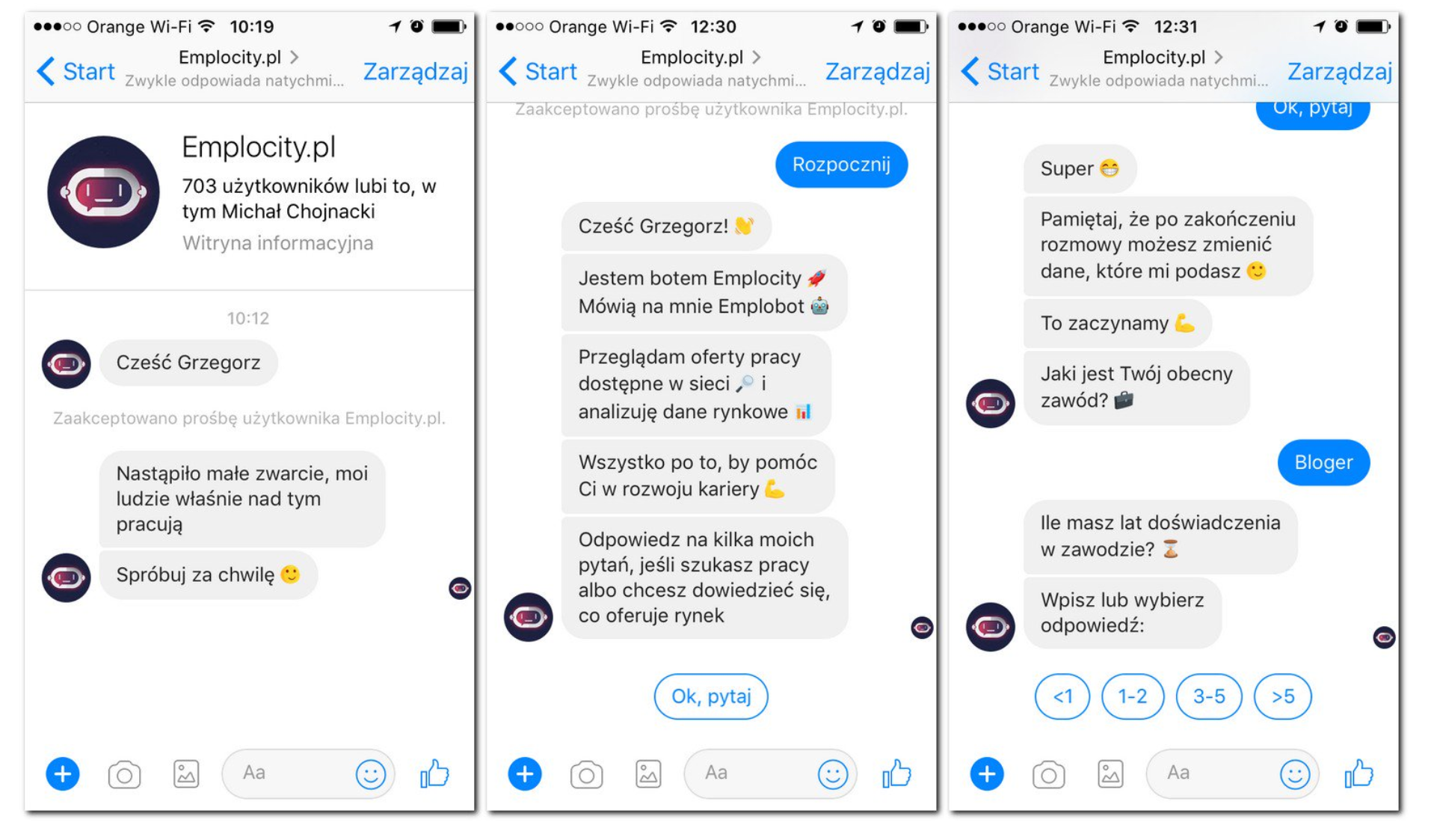 Przykładem z Polski jest rozwiązanie stworzone przez firmę Emplocity – chatbot Emplbot, z którego korzystają firmy takie jak np. Budimex czy Bank PKO BP. Emplbot jest chatbotem wspierającym HR w pierwszym etapie rekrutacji, gdzie zbiera wszystkie niezbędne informacje o kandydatach, przekazując je rekruterom w ramach stworzonego profilu zainteresowanego danym stanowiskiem Kowalskiego. Poniżej znajdziesz przykład krótkiej rozmowy między Emplbot a zainteresowanym pracą kandydatem: