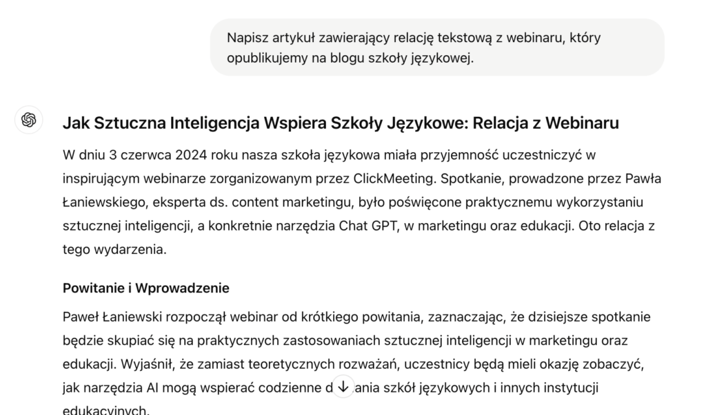 „Prześlę ci transkrypcję tekstową z webinaru. Na jej podstawie przygotuj propozycje nagłówków poszczególnych akapitów relacji tekstowej z tego wydarzenia. W następnym kroku będziemy je rozwijać, tak aby powstał długi artykuł, który zostanie opublikowany na portalu dotyczącym digital marketingu”.