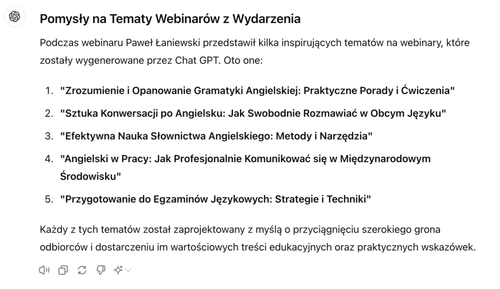 - Generowanie pomysłów: ChatGPT może dostarczać kreatywnych tematów na webinary, dostosowanych do specyficznych potrzeb i zainteresowań odbiorców.