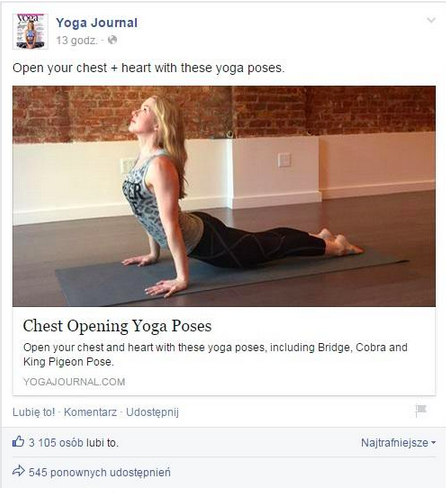 Z pewnością sprzedajesz znakomity produkt lub usługę. Warto jednak zadbać o to, aby publikowane przez Ciebie treści były na takim samym (lub wyższym) poziomie. Zwróć uwagę na poniższe zdjęcie pochodzące z Facebookowej strony magazynu Yoga Journal: