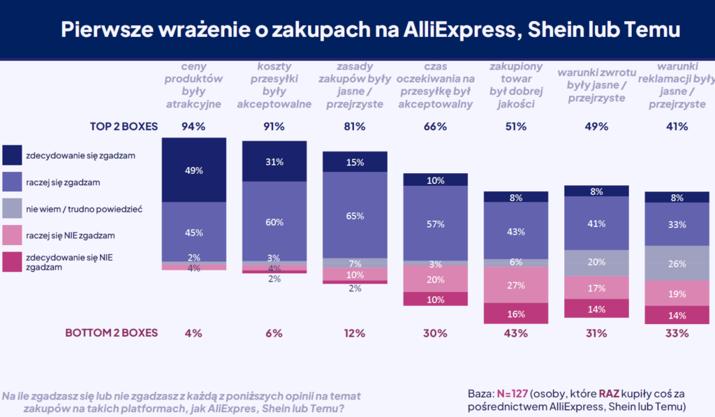 Jednym z pytań zadanych ankietowanym przez przedstawicieli Pollster było to, dotyczące pierwszego wrażenia o zakupach na AliExpress, Shein lub Temu. Większość pytanych przyznała, że ceny produktów oferowanych na tych platformach e-commerce były atrakcyjne (49% zdecydowanie zgadza się z tym stwierdzeniem, a 45% raczej się z nim zgadza), a koszty przesyłki – akceptowalne (w sumie przyznało to 91% ankietowanych).