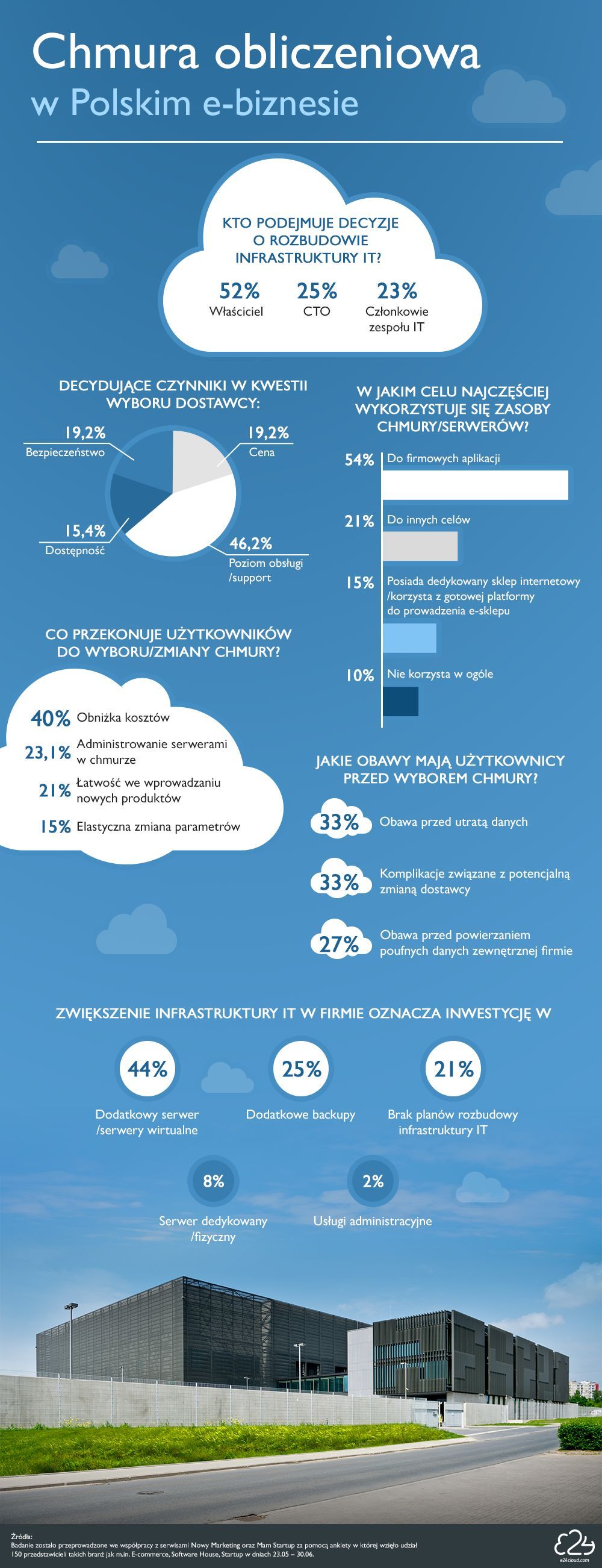 Widząc zwiększenie zapotrzebowania rynku na tego rodzaju usługi, e24cloud postanowił zapytać przedstawicieli e-biznesu, jakie jest ich zdanie na temat chmury obliczeniowej. I tak wśród odpowiedzi na pytanie z jakiej infrastruktury IT korzystają ankietowani, rozwiązania cloud znalazły się na drugim miejscu, ustępując jedynie miejsca serwerom in-house. Z odpowiedzi badanych wynika również, że decyzja dotyczące rozbudowy infrastruktury IT w pierwszej kolejności należy do właścicieli firmy (52 proc.), a następnie do CTO (25 proc.) oraz członków zespołu IT (23 proc).