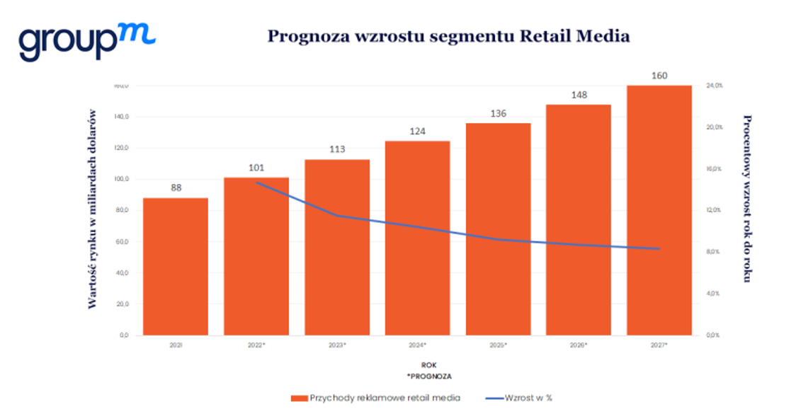 Rysunek 1. Prognoza wzrostu segmentu Retail Media. Źródło: “This Year, Next Year. 2022 E-Commerce & Retail Media Forecast”, GroupM, wrzesień 2022 oraz estymacja GroupM Poland