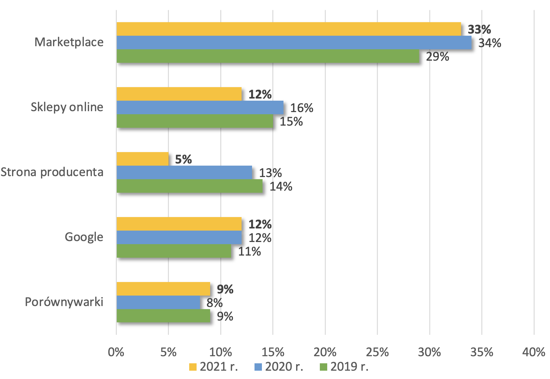 Coraz częściej cała ścieżka zakupowa odbywa się wewnątrz jednej platformy. Już teraz 34% polskich klientów e-sklepów wskazuje, że rozpoczyna ją właśnie w e-commerce. Znaczenia tej liczbie dodaje fakt, że wyszukiwarka Google stanowi początek ścieżki jedynie dla 12% użytkowników. To oznacza, że marki muszą szukać komunikacji właśnie na platformach zakupowych. Co więcej, ta komunikacja nie może się ograniczać jedynie do prezentacji produktu, czyli właściwie przygotowanych opisów produktów, ale musi zakładać szersze podejście do komunikacji, która będzie budowała nie tylko wiedzę o produkcie, ale również świadomość marki. Musimy pamiętać, że mówimy o całej ścieżce konsumenta, nie tylko jej ostatnim etapie, jak do tej pory.