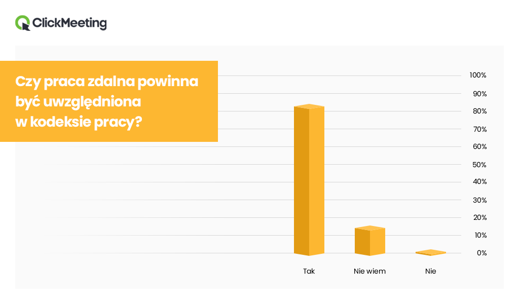 – Z naszego badania wynika, że Polacy oswoili się z pracą zdalną, potrzebują tylko odpowiednich regulacji prawnych i wsparcia ze strony pracodawców – mówi Dominika Paciorkowska, dyrektor zarządzająca w ClickMeeting. – Dzięki nowoczesnym narzędziom do wideokonferencji, takim jak platforma ClickMeeting, praca w zespołach może być wygodna i efektywna. Już ponad ⅓ firm dostrzega korzyści płynące z tego typu rozwiązań i planuje w przyszłości łączyć pracę stacjonarną z możliwością pracy zdalnej – dodaje Paciorkowska.