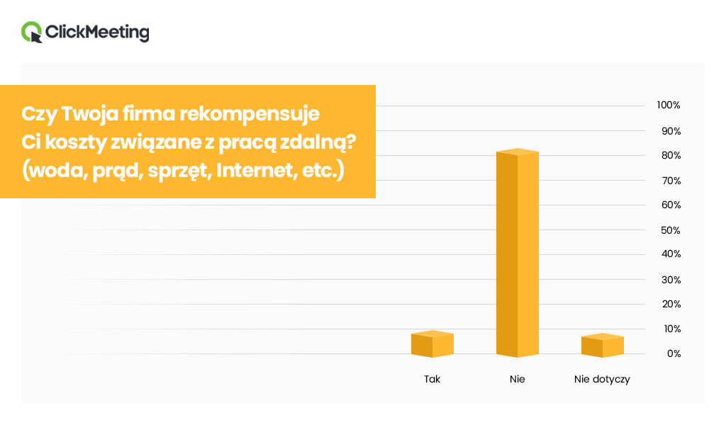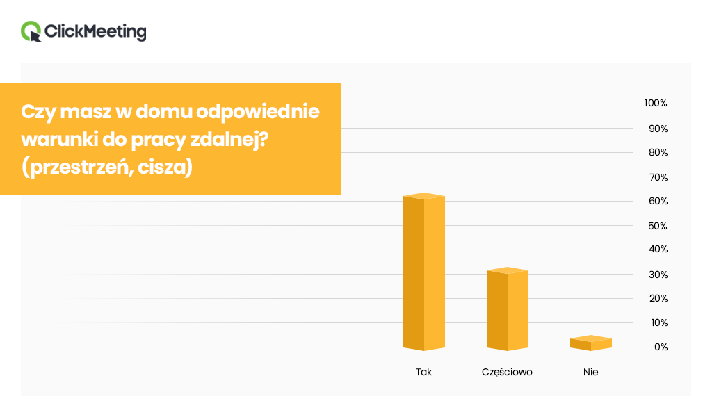 W porównaniu do poprzedniego raportu o pracy zdalnej opublikowanego przez ClickMeeting we wrześniu 2020, warunki do pracy z domu uległy nieznacznej poprawie – obecnie deklaruje je 63 proc. respondentów, o 4 proc. więcej niż we wrześniu. Jednocześnie nadal aż 37 proc. pracowników ma tylko częściowo odpowiednie warunki do pracy zdalnej lub nie ma ich wcale. Problem nie leży w kwestiach technologicznych – 92 proc. ankietowanych ma wystarczający sprzęt do pracy z domu. Aż 88 proc. posiada też odpowiednie łącze internetowe – to o 8 proc. więcej niż we wrześniu. Brakuje jednak odpowiedniej przestrzeni i ciszy.