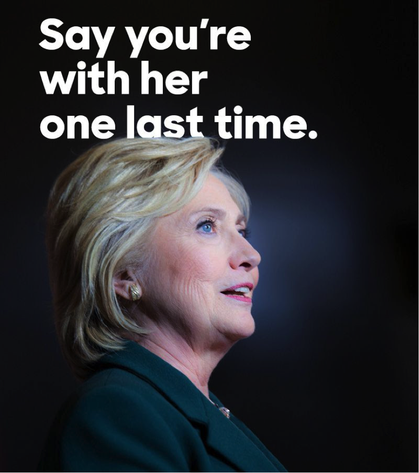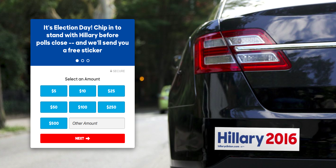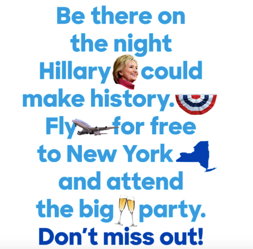 Około tydzień przed wyborami, gdy kampania wkroczyła już w decydującą fazę, oboje kandydatów rozpoczęło działania jeszcze intensywniej zachęcające do głosowania i przekazywania funduszy na sztaby wyborcze. Clinton zaoferowała najwierniejszym darczyńcom bilet VIP na wieczór wyborczy w Nowym Jorku u boku samej kandydatki – i (w porównaniu do reszty tekstowych wiadomości) tym razem wyjątkowo zastosowała grafikę, przekonującą dlaczego warto postawić właśnie na nią. Donald Trump zaproponował, że uwieczni nazwiska 2000 najhojniejszych darczyńców na specjalnej tablicy.