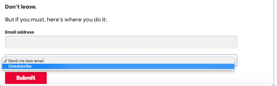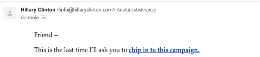 Sztab wyborczy Hillary Clinton postawił na możliwość wyboru: odbiorca nie musiał koniecznie wypisywać się z newslettera, mógł również wybrać opcję otrzymywania mniejszej liczby e-maili.