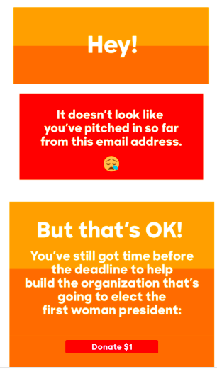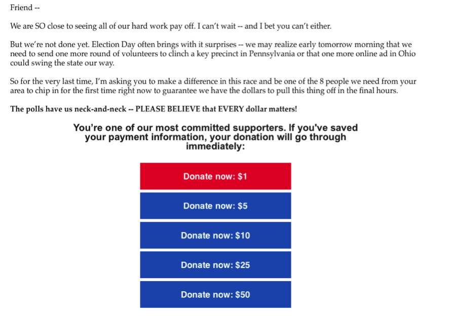 Ponadto, pomimo braku wpłaty nawet dolara na kampanie, odbiorca pod koniec wyścigu o fotel prezydencki, wciąż otrzymywał e-maile o treści: „Do tej pory wpłaciłeś już tak dużo. Pomóż nam jeszcze trochę.” lub „Jesteś jedną z osób, które najbardziej nas wspierają”. Niejednokrotnie komunikaty te stały w sprzeczności z danymi dynamicznymi (a w tym przypadku zgadzały się one ze stanem faktycznym), które politycy zamieszczali w pozostałych wiadomościach: