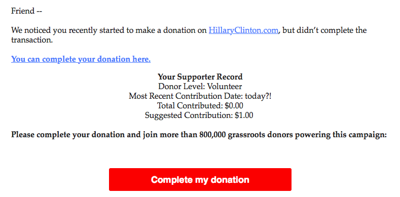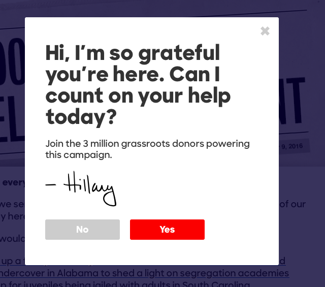 Co ciekawe, ze względu na specyfikę amerykańskich wyborów, na oficjalnych stronach kandydatów znajdowały się aż dwa formularze: jeden do subskrypcji newslettera, a drugi – znacznie bardziej eksponowany – do wykonania przelewu na rzecz sztabu wyborczego. Oprócz danych kart kredytowych wymagały również podania takich informacji jak branża oraz miejsce zatrudnienia. Na stronie Clinton funkcjonowało nawet specjalne okno pop-up: