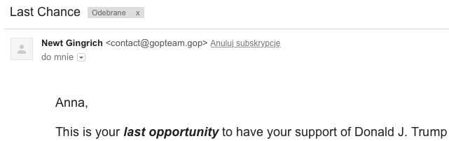 Częstotliwość wysyłek udowadnia jednak, jak ważnym elementem był e-mail marketing w ich kampaniach. Tym razem e-maile nie posłużyły politykom do argumentacji za głosowaniem na nich, ale stanowiły główny kanał zachęcający do finansowego wsparcia kampanii.