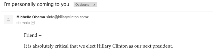 Ryc. Nadawcą wiadomości zachęcającej do głosowania na Clinton jest Michelle Obama