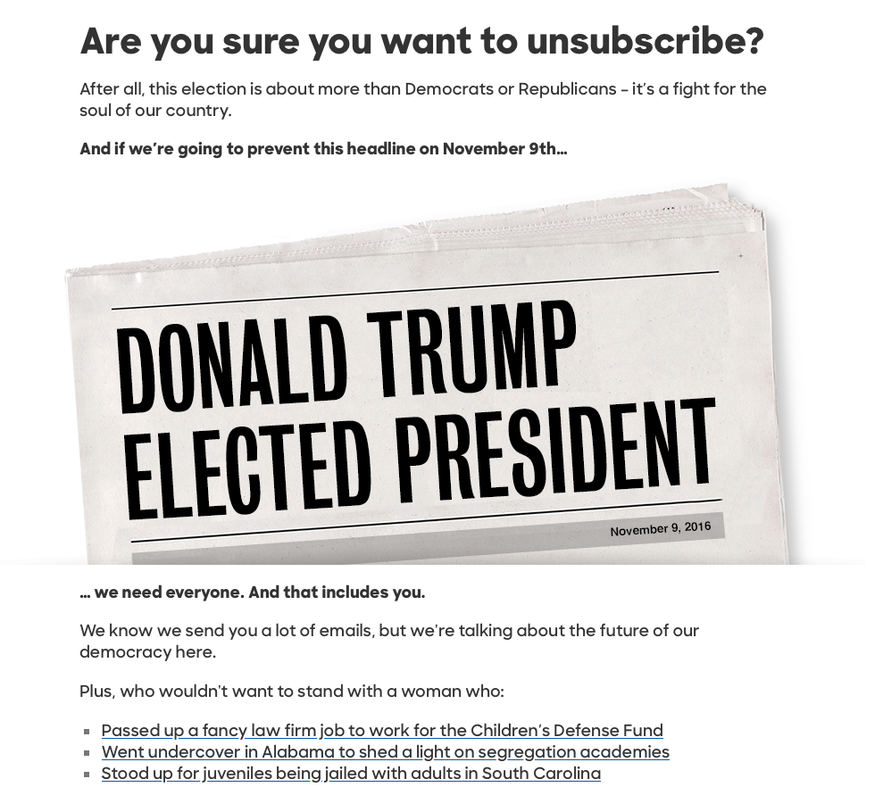 Jeśli jednak mimo wszystko wciąż chciał opuścić bazę subskrybentów, kandydatka Demokratów starała się przekonać go do zmiany decyzji. Link do wypisu prowadził bowiem do ciekawej, przemyślanej strony, argumentującej dlaczego warto zostać w kontakcie ze sztabem wyborczym Clinton. Co ciekawe, na opisywanej witrynie znalazło się sporo argumentów-linków, prowadzących do pozytywnych artykułów na jej temat. Strona wykorzystała też popularny humorystyczny GIF z Hillary poruszającą barkami (shimmy), a subskrybent do samego końca ma możliwość zmiany decyzji.