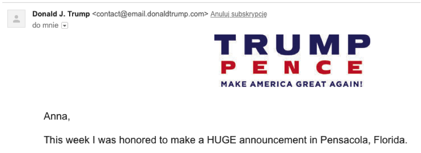 Ryc. Powitanie odbiorcy w wiadomościach od Donalda Trumpa