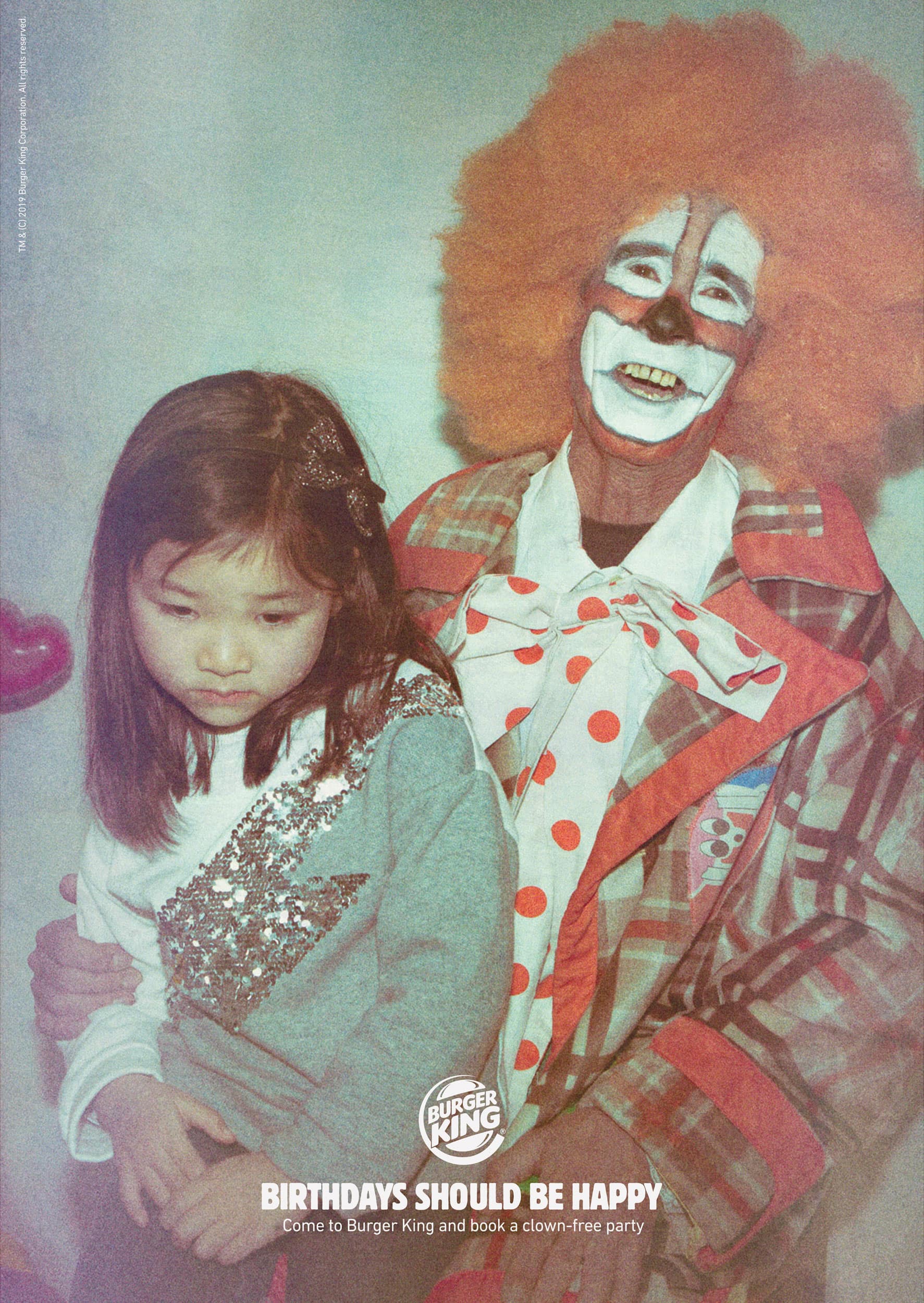 Burger King zaprezentował więc serię zdjęć, przedstawiających rozhisteryzowane małe dzieci w objęciach klaunów podczas swoich przyjęć urodzinowych. Kreacje okraszono podpisami „Urodziny powinny być szczęśliwe” z drobną wzmianką reklamującą „wolne od klaunów” przyjęcia w Burger Kingu.