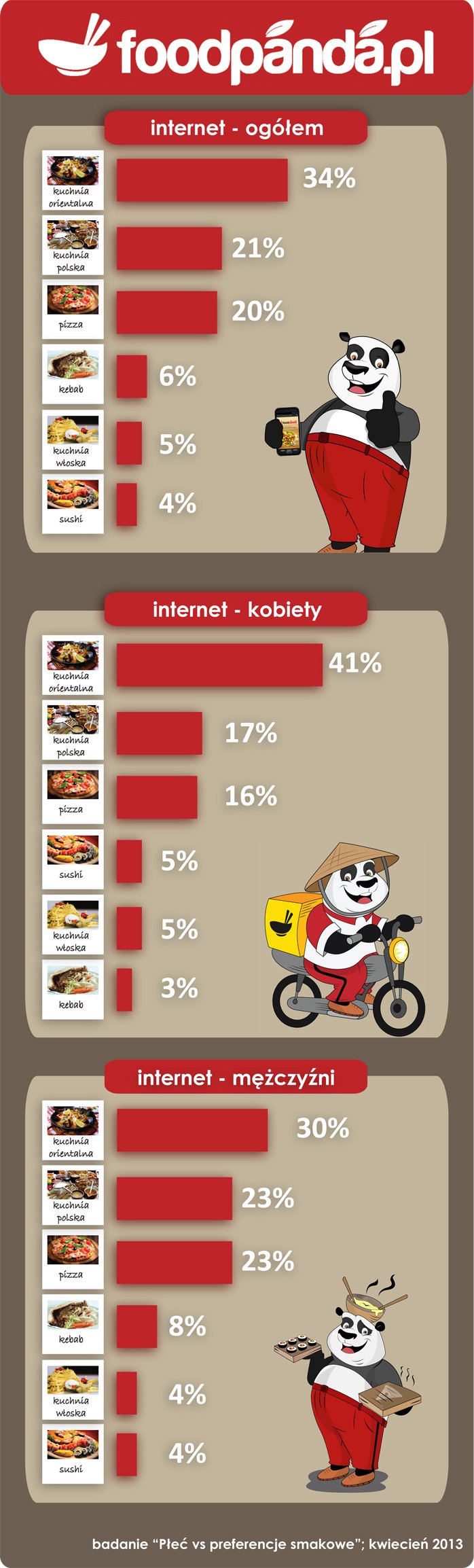 W gustach kulinarnych Polaków zachodzą duże zmiany. Wg serwisu Foodpanda.pl, spośród 10 najpopularniejszych restauracji, najchętniej wybieranych przez jego użytkowników, zaledwie dwie to pizzerie. Natomiast co trzecia potrawa zamawiana obecnie w internecie, to danie orientalne. – Chiny, Indie, kuchnia wietnamska – to smaki, które coraz częściej goszczą na polskich stołach. Obok nich możemy znaleźć tradycyjny polski żurek lub schabowy, gdyż właśnie te rodzime specjały zamawia w sieci 20 proc. osób – zauważa Michał Rokosz z Foodpanda.pl.