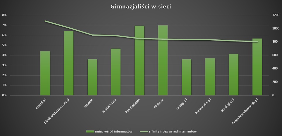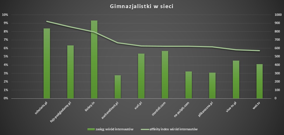 Ciekawą tendencję można zauważyć, patrząc na ranking serwisów z najwyższym Affinity Index. Bazując na tym parametrze widzimy, jakie serwisy są specyficzne (ponadprzeciętnie użytkowane) dla badanej grupy. Analizując serwisy pod tym kątem w grupie uczennic szkół średnich, wyraźnie widać, że czołowe miejsca zajmują dwa serwisy „demotywatoropodobne”: bezlitosne.pl, wixxy.pl,a reszta to serwisy związane z nauką. Liderem jest matematyka.pl, w pierwszej dziesiątce są jeszcze dwa serwisy matematyczne, a poza tym zainteresowaniem cieszą się też serwisy, dotyczące biologii, języków i literatury, np. granice.pl.