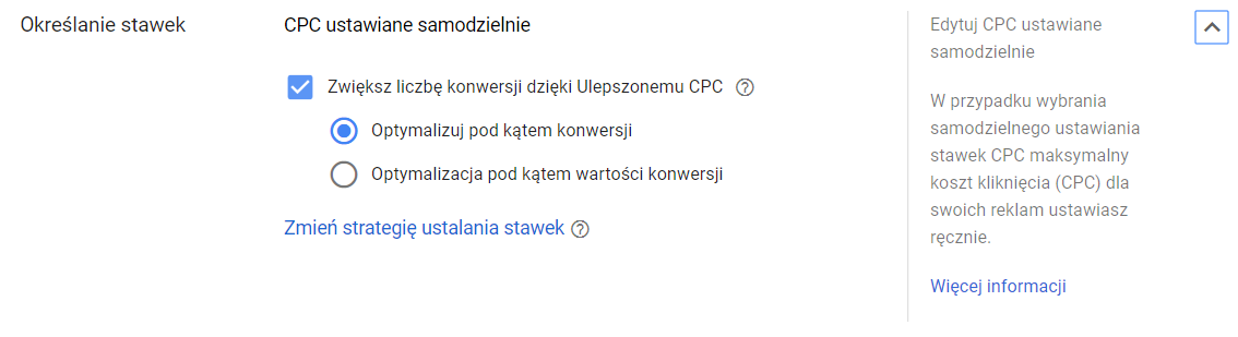 Ulepszone CPC dostępne jest jako funkcja opcjonalna przy samodzielnym określaniu stawek. Stosując tę strategię zezwalamy systemowi na automatyczne modyfikacje deklarowanych maksymalnych stawek CPC, jednak tylko w pewnych granicach. System może podnieść CPC najwyżej o 70%. Dzieje się tak tylko w przypadku aukcji, które z największym prawdopodobieństwem mogą spowodować pozyskanie konwersji. Natomiast w przeciwnym przypadku, tzn. w aukcjach słabo rokujących system może obniżyć oferowane CPC nawet o 100%, czyli zdecydować o braku emisji reklamy w danej aukcji.