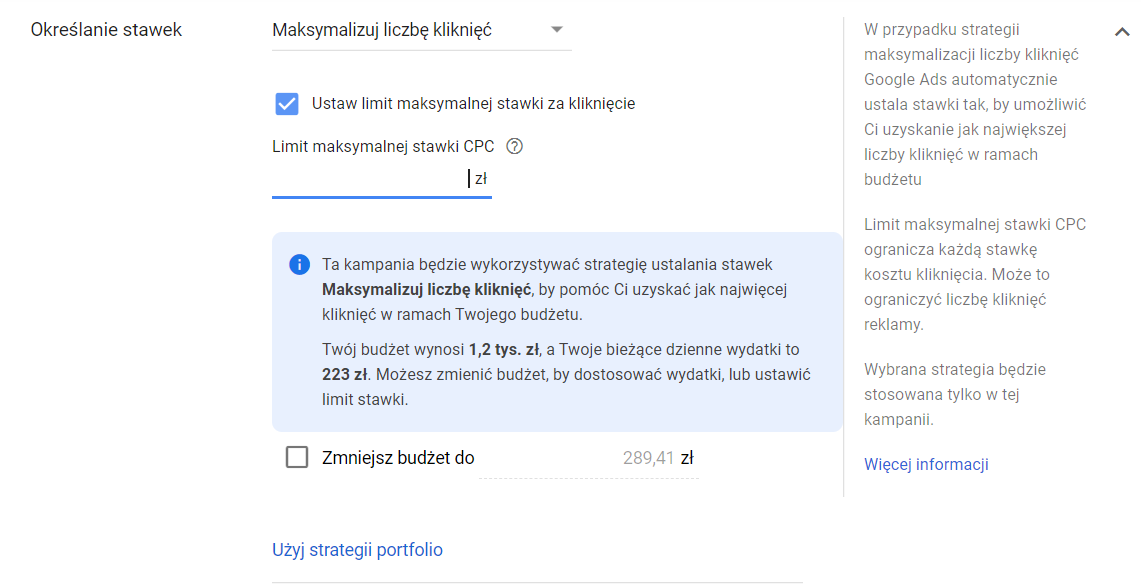 Nie zaleca się korzystania z limitów stawki CPC, ponieważ może to ograniczać automatyczną optymalizację.