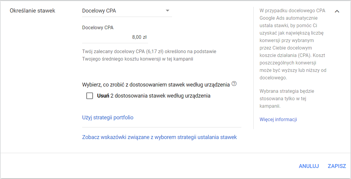 Nie zaleca się ustawiania limitów stawki CPC, ponieważ może to mieć niekorzystny wpływ na automatyczną optymalizację stawek. Należy jednak wspomnieć, że limity stawek są dostępne tylko w przypadku strategii portfolio, nie są dostępne w strategiach standardowych. W strategii możemy stosować modyfikatory stawek na urządzeniach, należy jednak pamiętać, że modyfikator nie zmiana stawek CPC, a nasze deklarowane CPA.