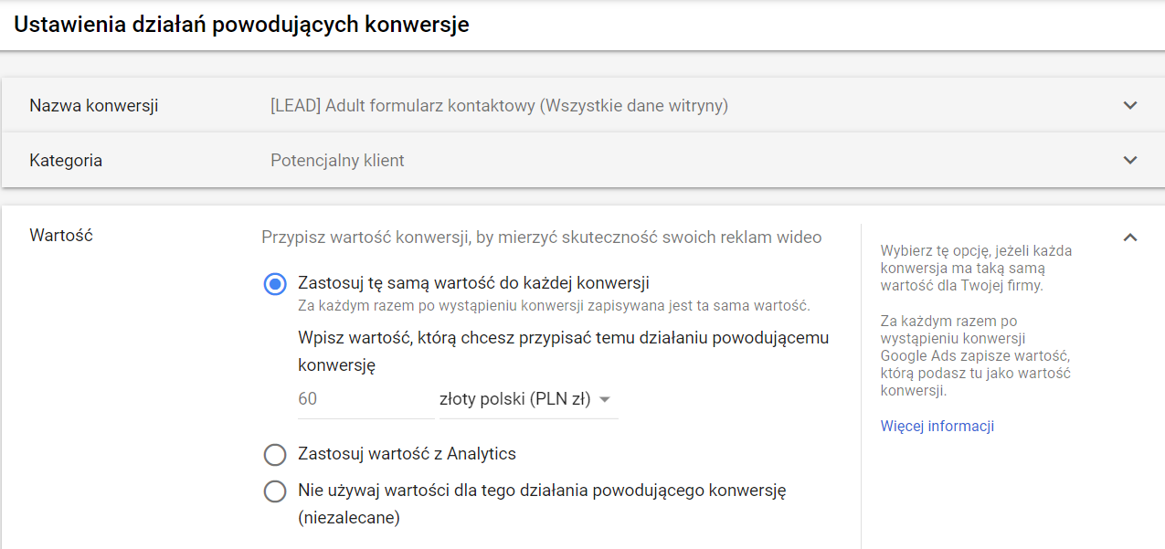 Konto musi jednak osiągnąć warunki progowe umożliwiające skuteczne działanie strategii. Jest to uzyskanie minimum 30 konwersji na przestrzeni ostatnich 30 dni. Większa liczba konwersji działa zdecydowanie na plus. Więcej danych historycznych spowoduje sprawniejsze działanie strategii. Koszty konwersji mogą osiągać różne wyniki, jednak docelowo system będzie dążył do uzyskania średniego wskazanego kosztu pozyskania.