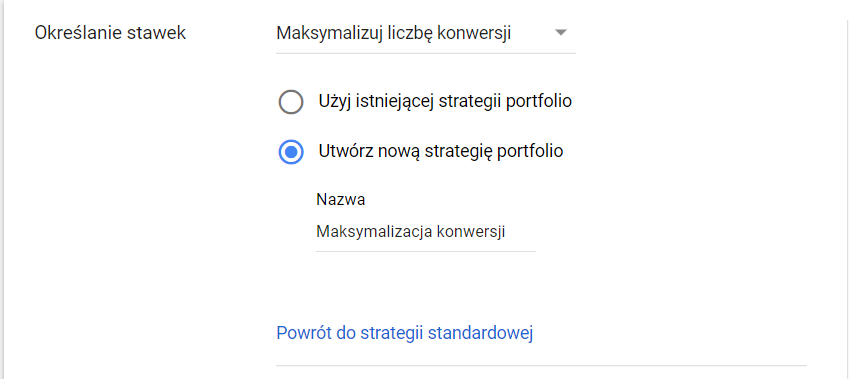 Strategia automatycznie zarządza stawkami, w taki sposób, aby zapewnić dostarczanie maksymalnej liczby konwersji w danym budżecie. Pamiętajmy, że system będzie dążył do pełnego wykorzystania budżetu dziennego, zatem warto zweryfikować jego wysokość w kontekście naszych możliwości. Jeżeli zależy nam na zachowaniu kontroli nad CPA, lepiej skorzystać ze strategii wspomnianej wcześniej tj. docelowy CPA.