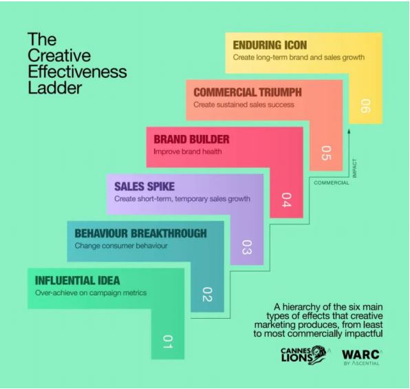 Aby podsumować powyższe odkrycia, Hurman i Field wraz z Cannes Lions i WARC, opracowali Drabinę efektywności twórczej, ramy do oceny postępu skutecznego marketingu. Skupia się ona na ujęciu wytycznych za pomocą wspólnych dla marketerów i agencji definicji i języka. Został zaprojektowany jako narzędzie ciągłego doskonalenia dla marketerów i agencji, umożliwiając im tworzenie bardziej konsekwentnych i skutecznych kampanii kreatywnych i inicjatyw. Co też istotne, w końcu dostrzeżona została rola strategicznego imputu w tworzeniu nagrodowych pomysłów – co w mojej skromnej opinii stratega – jest ukłonem nie tylko w stronę kreatywnych, wymyślających „kanneński kejs”, ale również całego zespołu i jego imputu w doszlifowanie owego pomysłu. Po to by nie był kolejnym nierealizowalnym „fejkiem”, jak to się okazało w przypadku kampanii „I sea” (Grey, Singapur).