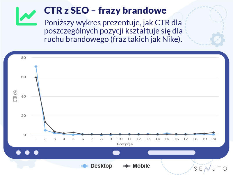 - Pierwsza pozycja na frazy brandowe ma wyższy CTR na urządzeniach desktopowych. Wynika to z faktu, że wygląd wyniku brandowego na desktopie jest bardziej rozbudowany. Ma ona również zdecydowanie najwyższy współczynnik CTR, co jest naturalne, ponieważ wpisując nazwę brandu mamy najczęściej intencję wejścia na konkretny serwis.