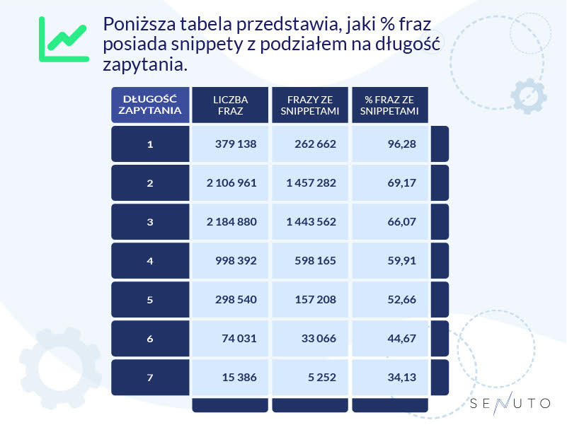 - Im krótsze zapytanie, tym więcej snippetów pojawia się w wynikach wyszukiwania. Sprawia to również, że CTR dla krótszych zapytań jest niższy.