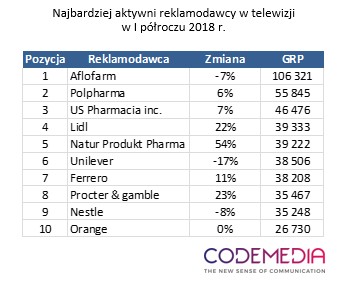 – Porównując półrocza w 2018 roku producenci wygenerowali o 4% więcej GRP niż w 2017 roku. Co ciekawe największy gracz Aflofarm w tym roku osiągnął mniejszą liczbę GRP o 7% – podsumowuje Marcin Hajdenrajch, Media Manager, Codemedia.