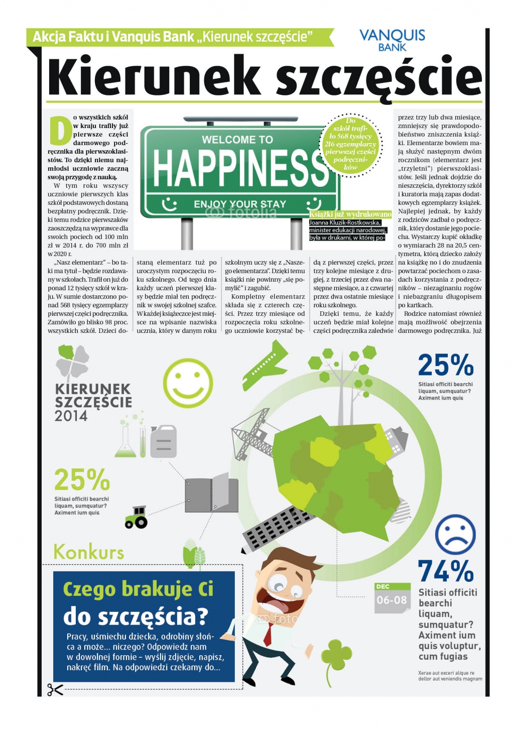 Celem działań było podkreślenie wizerunku Vanquis Banku jako instytucji, która jest blisko swoich klientów i ich codziennych spraw, a także zaangażowanie odbiorców w stworzenie raportu. Punktem wyjścia były badania dotyczące poziomów szczęścia Polaków w skali ogólnopolskiej i poszczególnych regionach przeprowadzone przez TNS OBOP na zlecenie Vanquis Banku. Drugim etapem był konkurs, w którym należało odpowiedzieć na pytanie „Czego brakuje Ci do szcześcia?”. Zgłoszenia można było wysyłać za pomocą platformy konkursowej na Fakt.pl, a konkurs otrzymał wsparcie promocyjne w mediach objętych kampanią. W sumie swoje odpowiedzi nadesłało ponad 730 osób, a na ich podstawie powstał raport, który ukazał się na łamach „Faktu Kraj” i Fakt.pl.