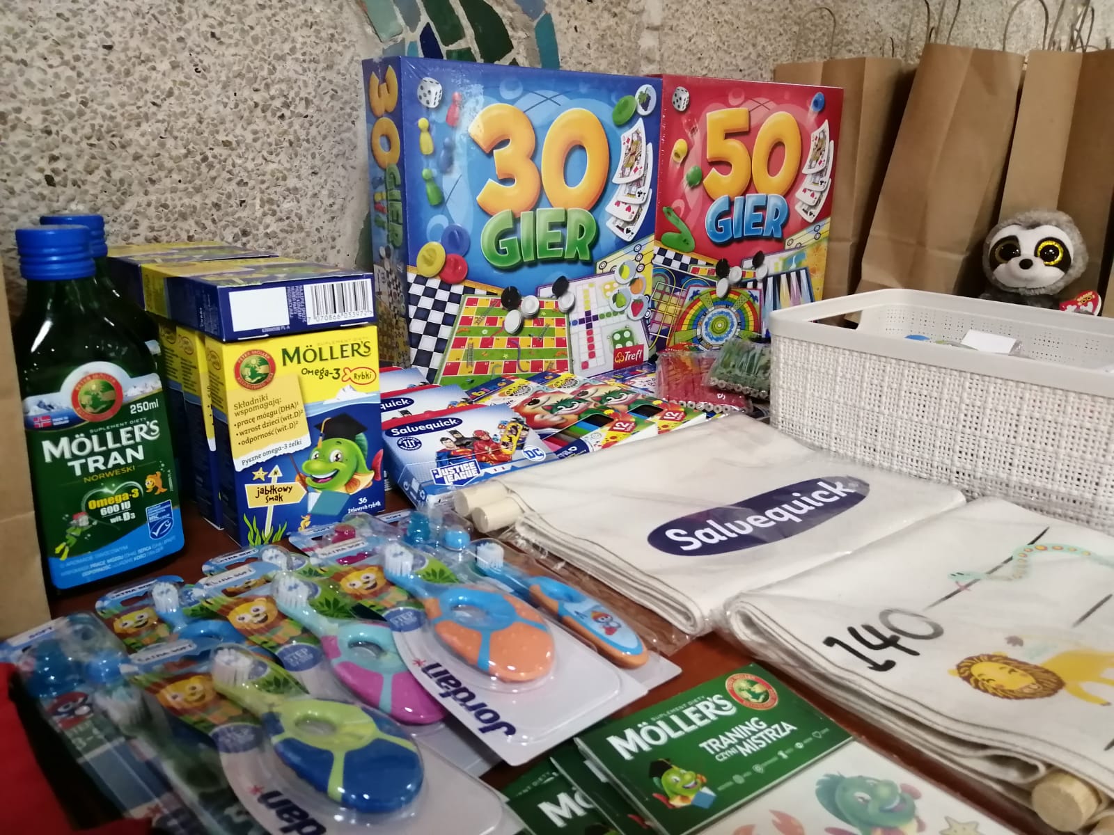 Do dzieci i szpitala trafiło mnóstwo podarunków zakupionych przez Communication Unlimited: kredki, kolorowe długopisy, temperówki i inne przybory szkolne, balony oraz zestawy gier. Orkla Care przekazała dzieciom m. in. znane z reklam Bodymax maskotki leniwców, kolorowanki i plastry opatrunkowe Salvequick, a także trany i żelki Mӧller’s Omega-3, multiwitaminowe żelki Bodymax Bodymisie, pasty i szczoteczki do zębów Jordan. Fundacja Medicover przekazała worki na obuwie, a młodzi piłkarze koszulki z logo swojego klubu.