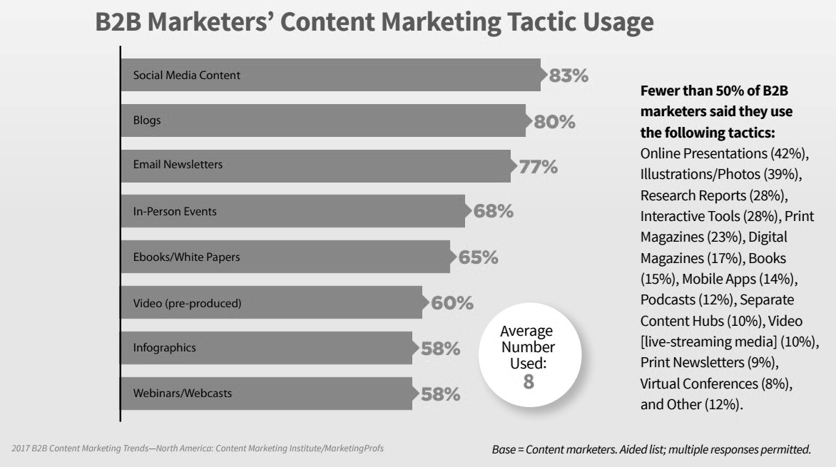 Statystyczna firma stosuje obecnie 8 taktyk w różnych rodzajach mediów i kanałach. To oznacza, że to co do niedawna było tylko mile widziane, czyli video, zdjęcia, wszelkie grafiki oraz produkcja i edycja audio, stają się must have. Powiedzmy to głośno i dobitnie: goły (za przeproszeniem), jednokolumnowy blok tekstu bez oprawy nie działa! Nawet algorytm Google’a go nie lubi, a co dopiero klient.