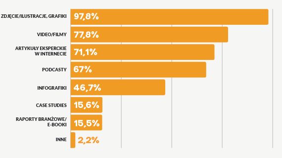 Zacznijmy od tego, co było. W 2018 roku blisko 98% firm, deklarujących korzystanie z narzędzi content marketingowych, dzieliło się ze swoimi odbiorcami treściami wizualnymi – zdjęciami i grafikami, a niespełna 78% – materiałami wideo. To oczywisty wybór, jeśli weźmiemy pod uwagę specyfikę branży. Pokazuje jednak, że firmy z branży wnętrzarskiej dosyć obligatoryjnie podchodzą do wyboru narzędzi content marketingowych. Treści, które wymagają nieco większego zaangażowania związanego z analizą wybranego zagadnienia, a więc infografiki, raporty czy e-booki, powstają rzadko.