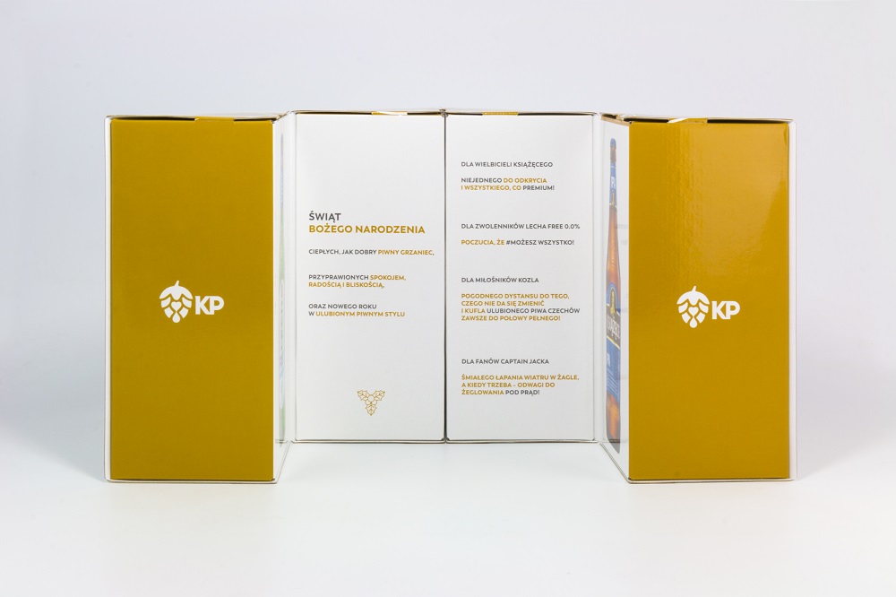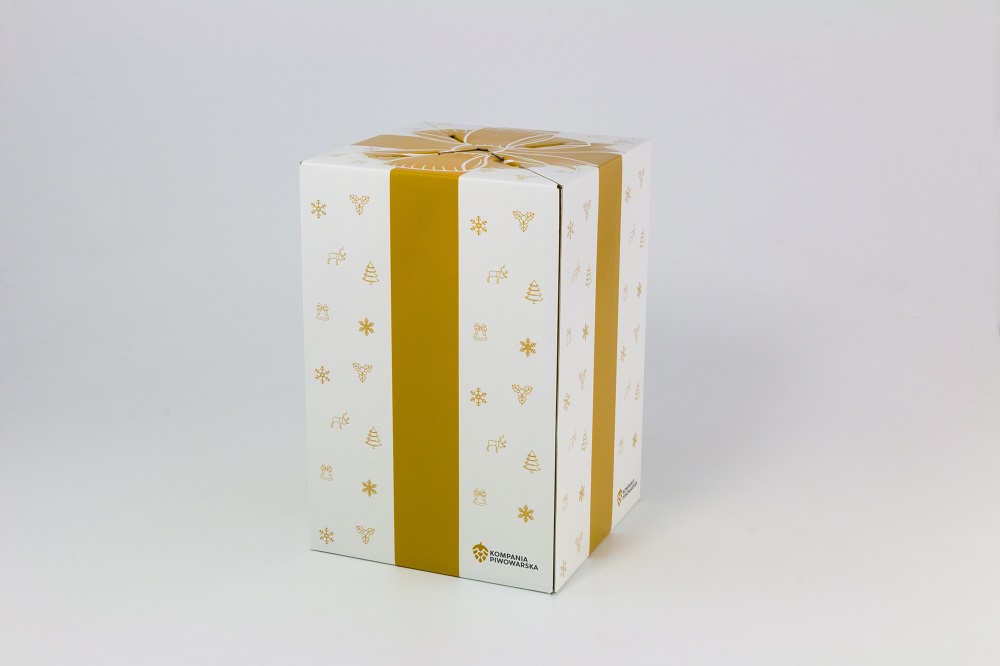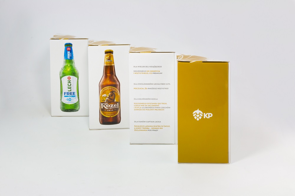 Kolejną ważną funkcją kofretu, powinna być funkcja transportowa. Pamiętajmy o tym, że nasz kofret trafia do punktu sprzedaży „zatowarowany”! Ogromnie ważne jest dobranie odpowiednich materiałów, tak aby trafił do klienta w nienaruszonym stanie. Samo zapewnienie stabilności produktów wewnątrz opakowania to niemałe wyzwanie. W przypadku lekkich produktów o regularnych kształtach sprawdzi się kartonowa wkładka z odpowiednio wyciętymi gniazdami na produkt. W przypadku produktów cięższych oraz takich, których ze względu na kształt nie przytrzyma gniazdo wycięte w kartonie stosuje się specjalne wypraski PET lub wytłoczki z pulpy papierowej, osłonięte dla efektu wizualnego kartonową maskownicą. Ale co w przypadku jeszcze cięższych produktów? Tu najczęściej sięgamy po tekturę falistą – odpowiednio przygotowany projekt, potrafi dać znakomity efekt. Przykładem takiej produkcji może być czteropak świąteczny Kompanii Piwowarskiej z 2018 roku. Opakowanie na 4 butelki piwa (łączna waga ponad 2,5kg) zostało wyprodukowane na tekturze falistej kaszerowanej kartonem. Każda z butelek jest osadzona w swojej „ćwiartce”, dzięki czemu jest doskonale zabezpieczona w transporcie. Ciekawy design pozwala na złożenie w prostopadłościan, dodatkowo zabezpieczony magnesami neodymowymi dla stabilności. Takie pomysłowe rozwiązanie pozwala na zwiększenie powierzchni informacyjnej.