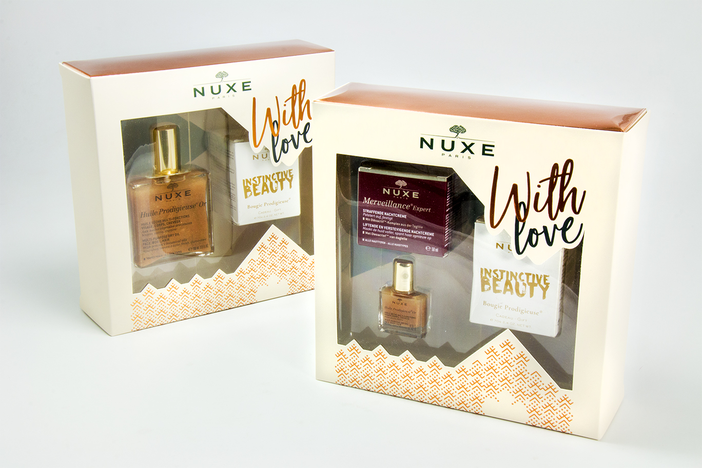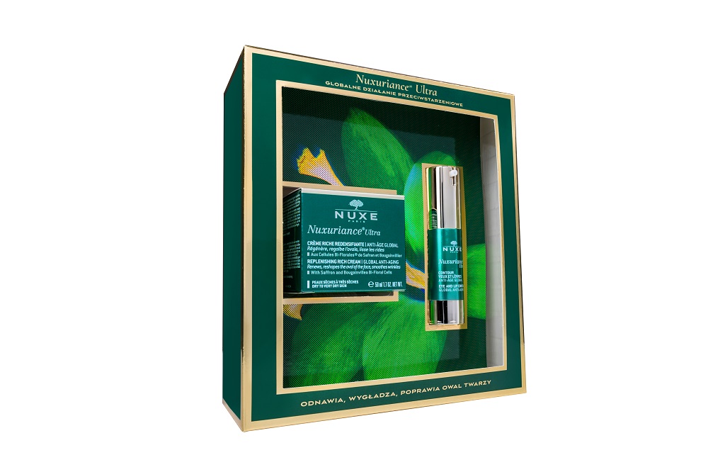 Oczywiście, najważniejszą z nich jest funkcja marketingowa – wiadomo, kupujemy (my, konsumenci) głównie „oczami”. Nasz produkt powinien wyróżniać się na półce – przyciągać wzrok kolorystyką lub kształtem, tak aby przykuł od razu uwagę klienta. W przypadku opakowań świątecznych możemy spodziewać się na półkach odcieni zieleni oraz czerwieni przyozdobionych złotem – tu ciekawym pomysłem może być odejście od tego szablonu i zastosowanie innej kolorystyki, lub zrezygnowanie z typowej świątecznej ornamentyki (bombki, choinka). Ciekawym przykładem, jaki mogę podać z własnego podwórka, są kofrety świąteczne kosmetyków Nuxe. Możemy tu zaobserwować bardzo subtelne motywy – takie jak wycięcia wokół okienka w kształcie gór, przyprószonych miedzianym hot-stampingiem. Na kolejnym zdjęciu widzimy kofret w klasycznych świątecznych barwach (zielono-złoty), pozbawiony natomiast graficznych akcentów świątecznych. Rozwiązanie takie powoduje, że klient w punkcie sprzedaży również po okresie świątecznym chętnie sięgnie po tak estetyczny produkt.