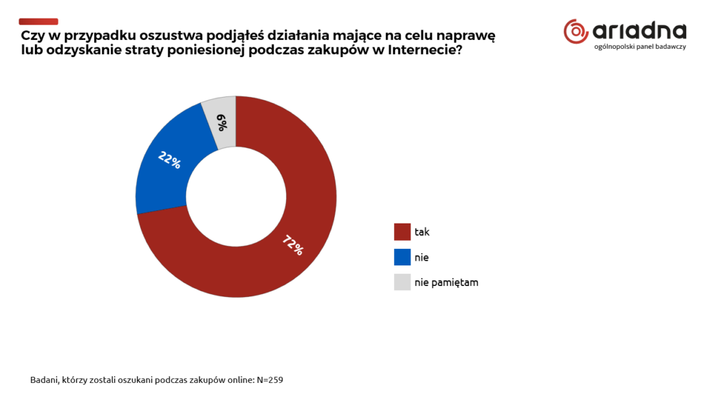 Około 1 na 4 osoby (26 proc.) została w przeszłości oszukana w sieci przez podmioty podające się za „prawdziwy” sklep. Pozytywnym sygnałem jest jednak to, że zdecydowana większość tej grupy, bo 72 proc., podjęła działania mające na celu naprawę lub odzyskanie straty poniesionej podczas zakupów. Wskaźniki te nie zmieniły się znacząco od zeszłego roku, kiedy wyniosły odpowiednio 24 proc. i 71 proc.