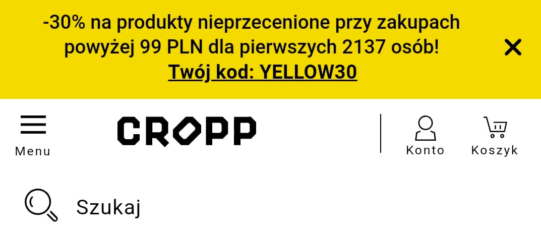 W jednej z ostatnich promocji dostępnych w sklepie internetowym, pojawił się komunikat: „30 proc. na produkty nieprzecenione przy zakupach powyżej 99 PLN dla pierwszych 2137 osób! Twój kod to: YELLOW30„.