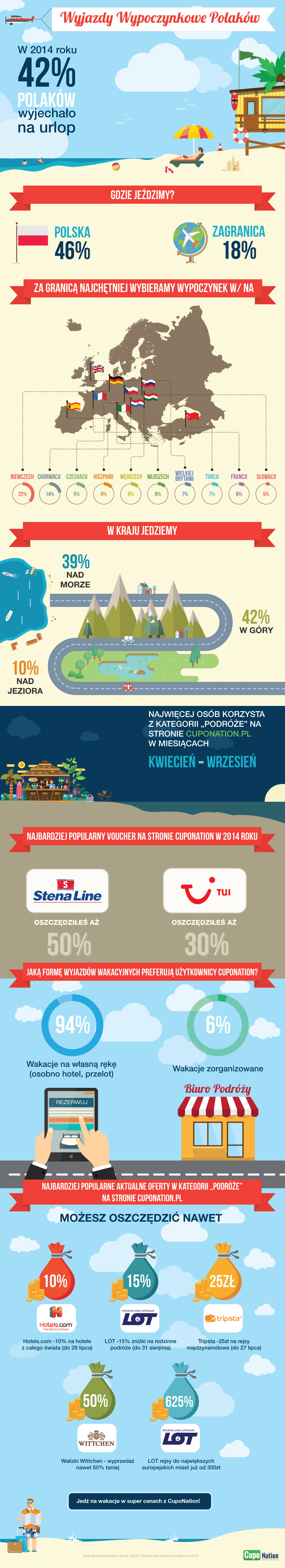 Największe zainteresowanie ofertą związaną z podróżami portal CupoNation odnotował w miesiącach od kwietnia do września. W większości z portalu korzystały osoby, które preferowały zaplanowanie wakacji na własną rękę (osobna rezerwacja przelotu i hotelu) – aż 94% użytkowników. Niezależnie od rodzaju preferowanego wypoczynku warto skorzystać z oferty CupoNation przygotowanej w kontekście wakacji 2015. Na portalu znajdziemy ekskluzywne kody rabatowe m.in. na 10% zniżki do hotels.com – portalu oferującego hotele na całym świecie oraz 25 zł zniżki na przeloty międzynarodowe do portalu tripsta.