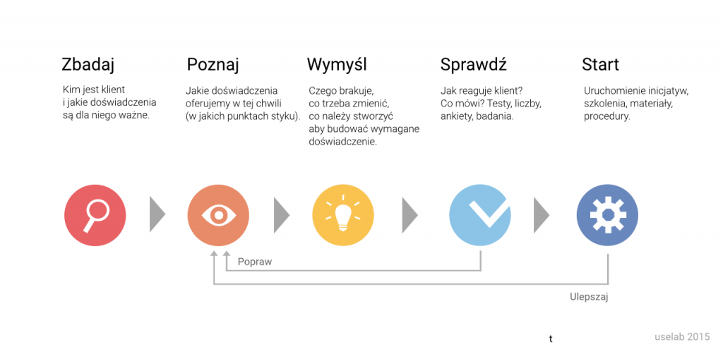 Następnie definiujemy aktualne doświadczenia klientów w kontakcie z marką. Mapujemy wszystkie punkty styku z klientem (np. telemerketing, biuro obsługi klienta, punkty sprzedaży, magazyny, serwisy www, doradcy, etc) i sprawdzamy jak wygląda proces w każdym z nich. Pytamy klientów co lubią, a czego nie. Co doceniają, a co by zmienili. Dzięki temu możemy stworzyć np. mapę doświadczeń klientów (Customer Experience Map) i na jej podstawie wspólnie z naszym klientem widzimy, gdzie należy rozpocząć pracę, co przyniesie szybkie, co kosztowne, co krótko, a co długotrwałe rezultaty. Wtedy wspólnie kreujemy inicjatywy mające zmienić firmę i rozpoczynamy ich kaskadowe wdrażanie w całej organizacji. Niezwykle ważny jest fakt, że proces ten powtarza się, bo jednym z jego najistotniejszych elementów jest jego ulepszanie na podstawie informacji zwrotnej od klientów, zmian na rynku, w ofercie czy firmie.