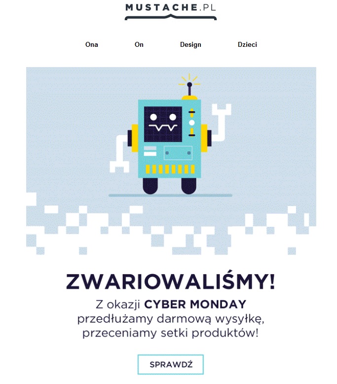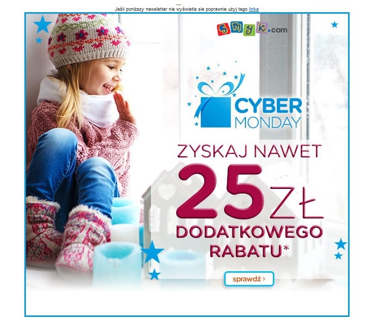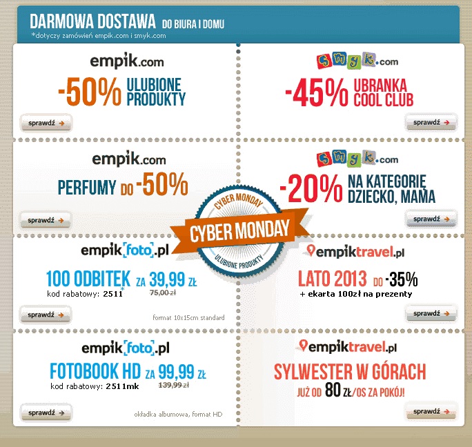 Cyber Monday nie jest jeszcze u nas tak popularny jak w USA. Jego potencjał marketingowy jest dużo mniej wykorzystywany niż Black Friday. Może być to spowodowane tym, że promocje w Polsce daleko odbiegają od tych w USA i nie różnią się bardzo od tych oferowanych przy okazji innych świąt. Jednak z roku na rok zainteresowanie tym dniem wzrasta i polskie sklepy biorą pod uwagę ten dzień w swoich działaniach marketingowych. Kilka przykładów poniżej: