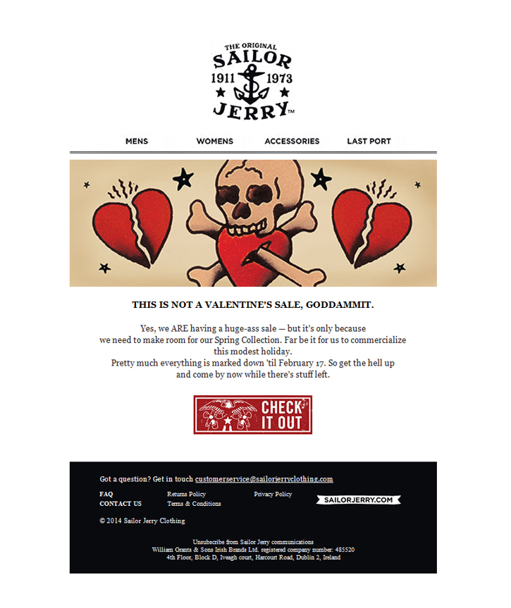 Z okazji Czarnego Piątku do skrzynek odbiorczych naszych klientów trafi niezliczona liczba newsletterów utrzymanych w kolorze czarnym, zaś 14 lutego wiadomości – okraszone serduszkami i różami – barwić się będą wszystkimi odcieniami różu. Zaszalej nieco i odejdź od sztampowych kolorów i zwrotów! Czarny Piątek może stać się Różowym Piątkiem, jeśli wiesz, że twoim klientom spodoba się ta koncepcja. Na taki pomysł wpadł sklep Dear Miss Modern, argumentując decyzję o zmianie nazwy święta słowami „ponieważ czarny brzmi po prostu zbyt ciemno”. Ciekawym przykładem odwrócenia standardowego schematu do góry nogami może być także mailing firmy Sailor Jerry, która wykorzystała Święto Zakochanych na wysłanie zdecydowanie antywalentynkowego newslettera. Nietuzinkowy tytuł maila “A sale, hell yeah. A Valentine’s sale, hell no.”, treść wiadomości oraz grafika na pewno zwróciły uwagę użytkowników i pozwoliły wyróżnić się firmie w natłoku „sztywnych”, cukierkowych kampanii walentynkowych.