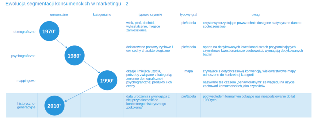Takim wydarzeniem jest chociażby powstanie iPhone’a, który zapoczątkował rewolucję na rynku telefonów komórkowych, co w konsekwencji mocno wpłynęło na nowe pokolenia. Segmentacja historyczno-generacyjna odwraca trend, który dążył do odejścia od statystyk demograficznych w stronę analiz wewnątrz kategorii.